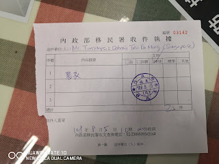 Photos #4 and #5: Acknowledgement of Receipt for the submission of documents/petition from the National Immigration Agency, Ministry of the Interior, Taipei, Taiwan